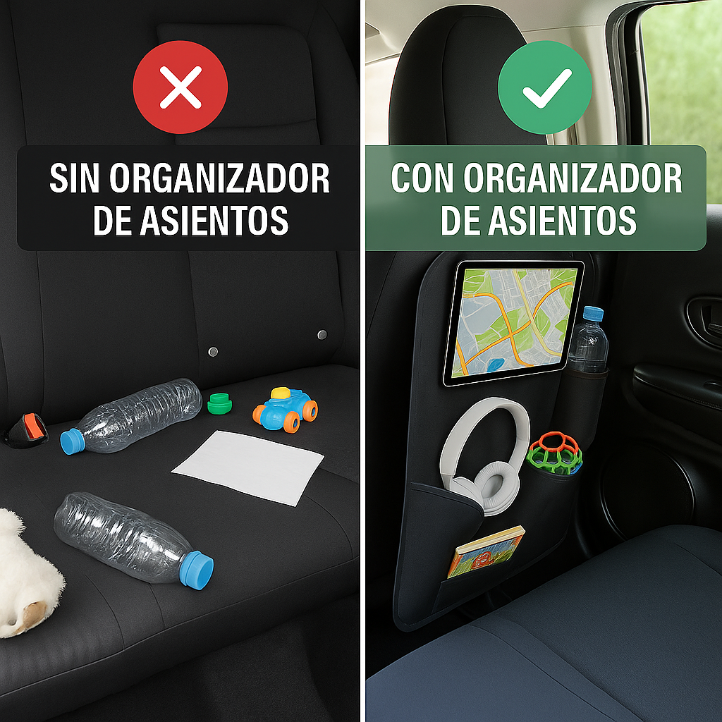 Ordená tu auto y manejá con total tranquilidad. Llevate 2 organizadores de asiento para tener todo a mano (botellas, auriculares, juguetes, tablets, snacks) + 1 soporte magnético ultraresistente para celular, perfecto para GPS y llamadas seguras.